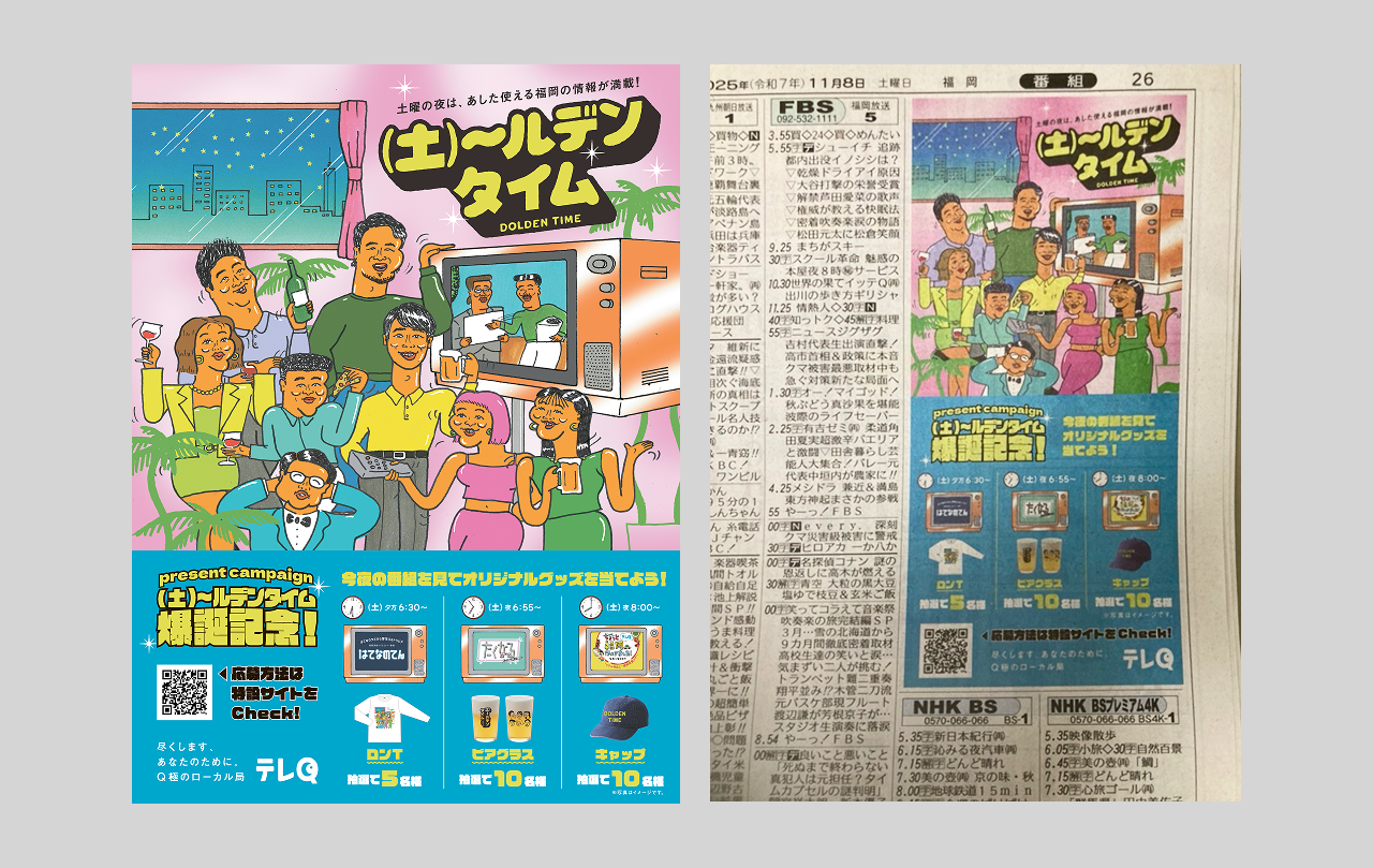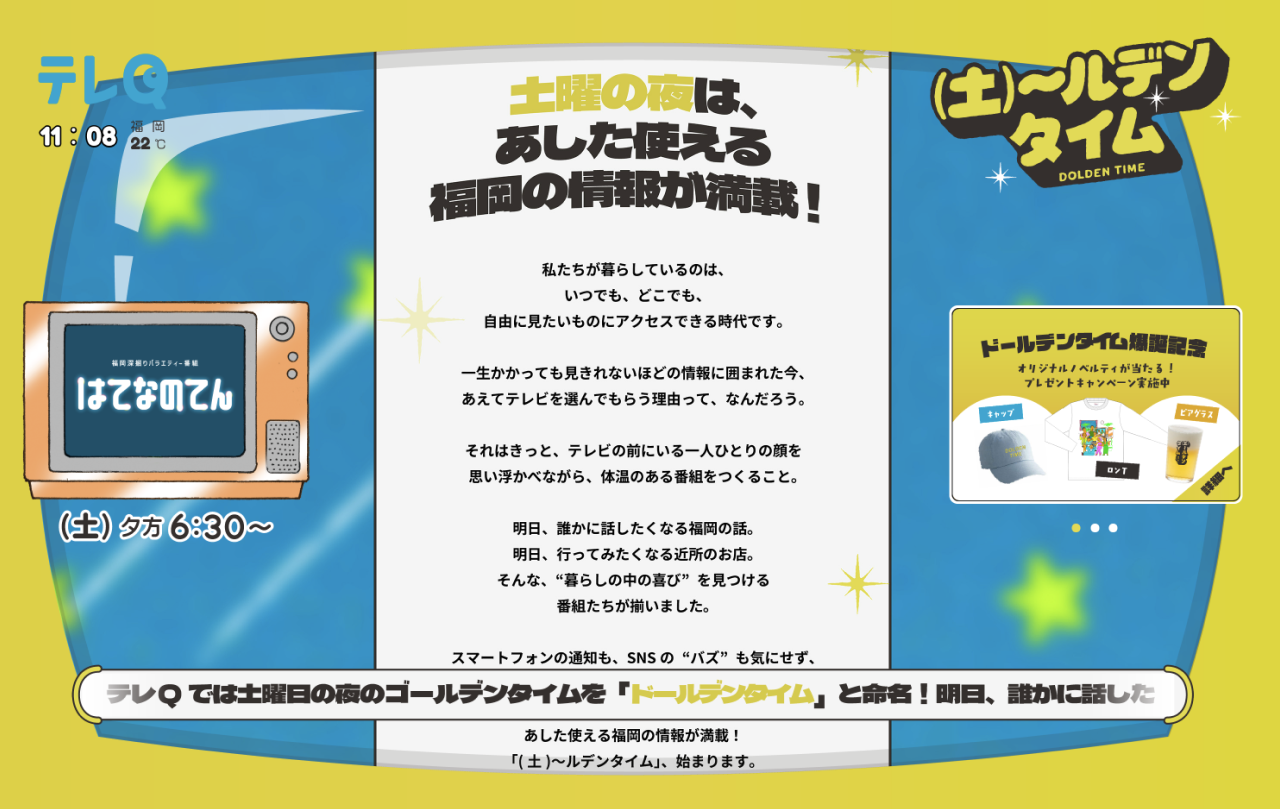 テレQが自社制作する3番組「はてなのてん」「たくなる」「ちょっと福岡行ってきました」を放送する土曜日夜6時30分から夜9時を「土~ルデンタイム」と命名し、新たなキャンペーンをスタートさせました。